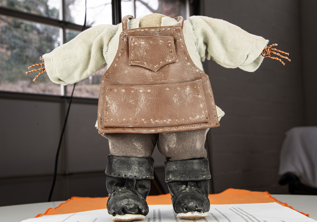 The following slides show the progress of the Professor Asset. First the finished product after lookdev in Substance Painter. The next 2 slide are frames from the photogrammetry shoot with and without the apron, which we wanted separate control of in the rig. Next, the raw scan data output from Agisoft Metashape, then the texture output. The texture was put through a delighting process before being further modified in Painter for the final character. Lastly, we have a native 3D asset for the welders goggles which weren't built in puppet form, but crafted to match the existing scans.